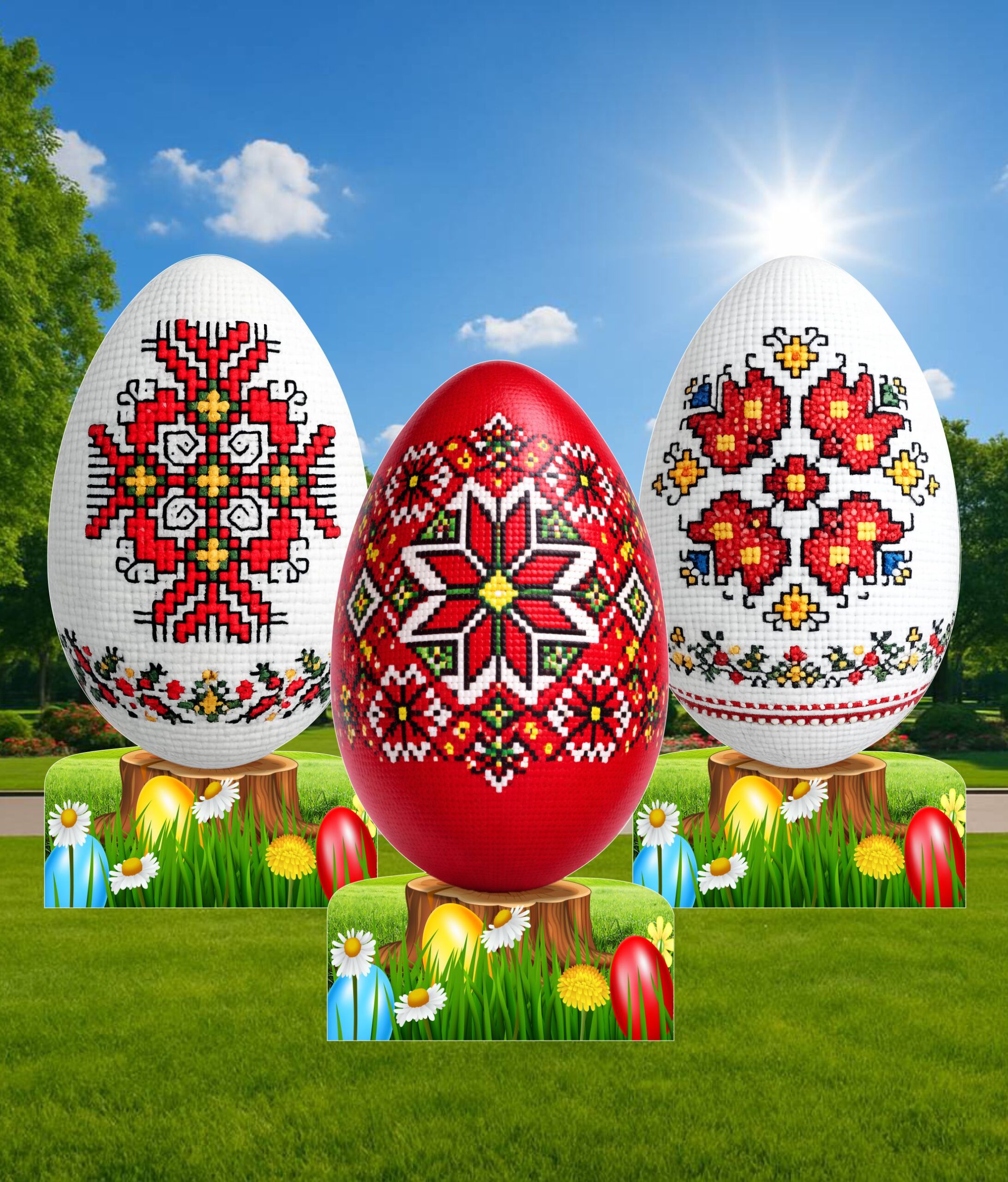 3Д обемни фигури на Композиция 47- 3 броя ВЕЛИКДЕНСКИ ЯЙЦА С гобеми ШЕВИЦИ -червено и 2 броя бели яйца .
